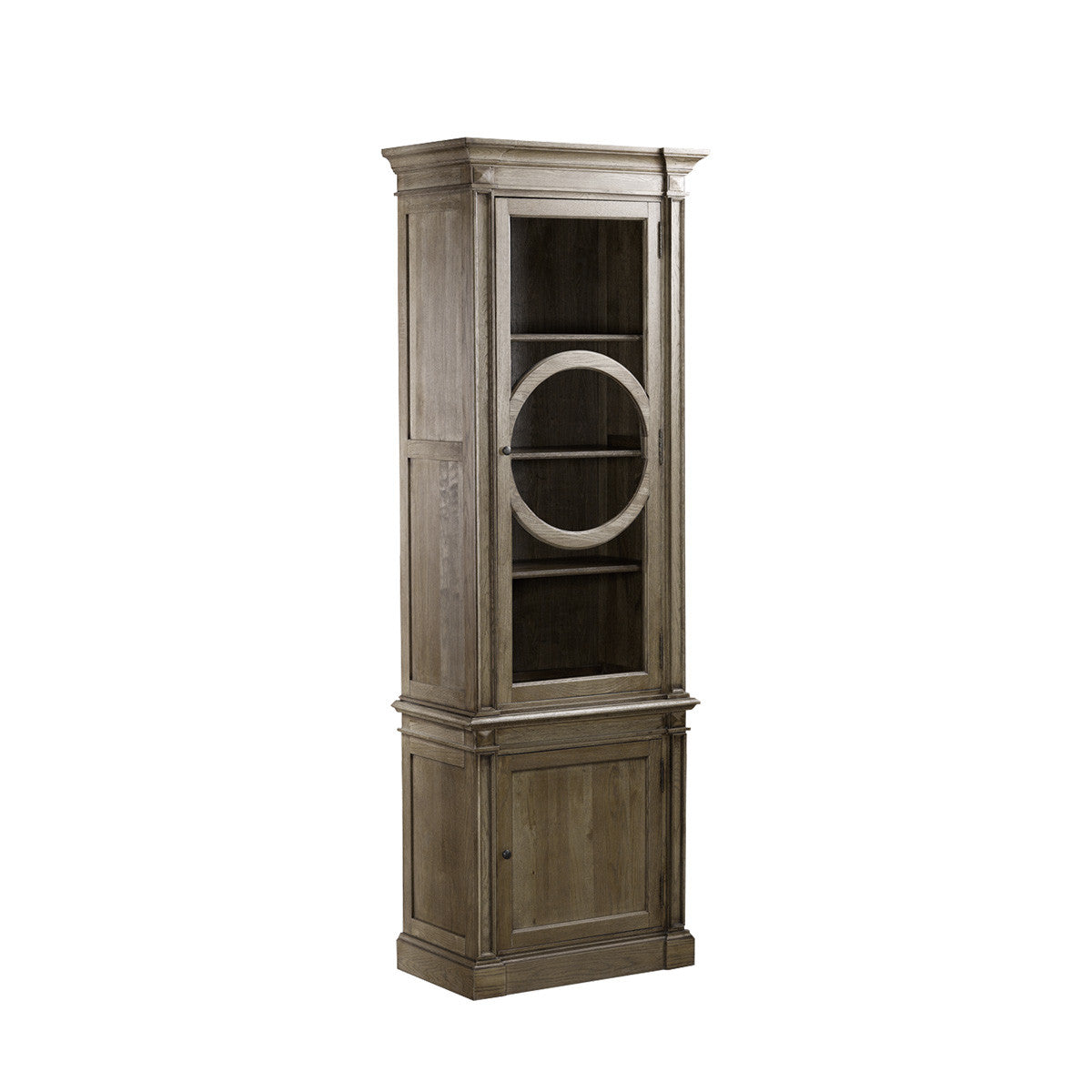 Витрина во французском стиле со стеклянной дверцей. Три фиксированные полки для хранения в открытой ее части и две фиксированные полки - в закрытой. Изготовлена из массива состаренного дуба. Створки украшены ручками из античной латуни. Древесина отшлифована и обработана металлической щеткой для усиления рельефа дерева, завершающая патинированная отделка.Поставляется в собранном виде.