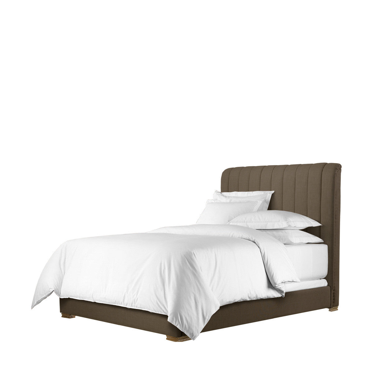 Кровать с высоким мягким изголовьем с обивкой из натурального бельгийского льна . Оснащена опорами для матраса.Ножки кровати изготовлены из ясеня.