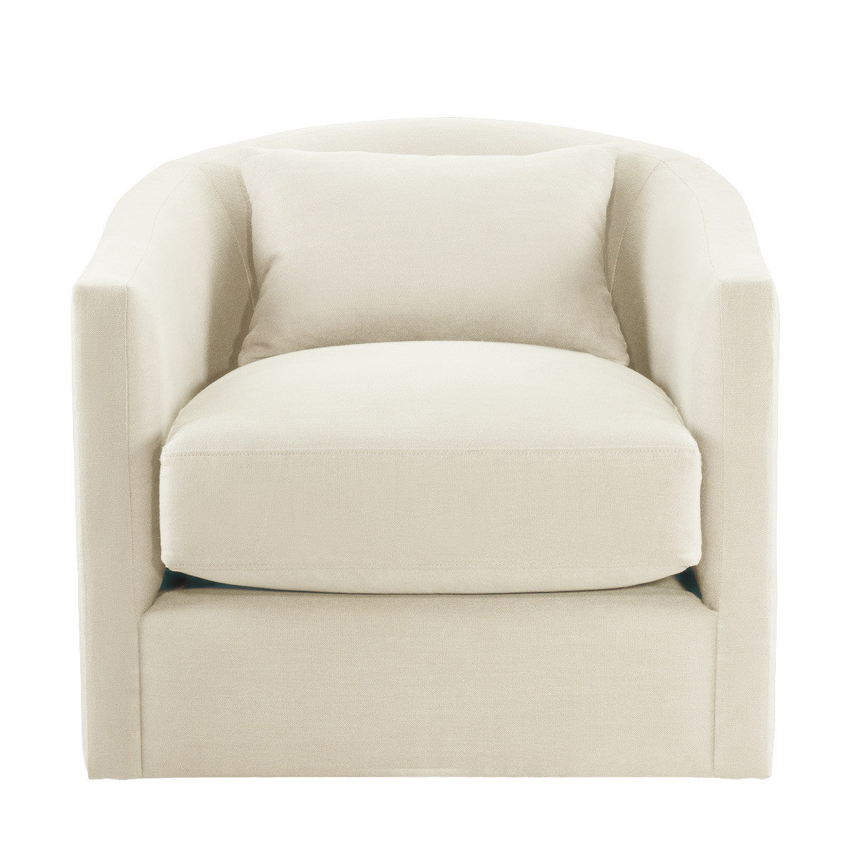 Лаконичное кресло в форме бочонка, изготовленное в обивке из натурального льна. Шарнирный механизм. Продается в комплекте с подушкой с фирменным логотипом. Наполнение координационной спинки и подушек: 50% пух + перо и 50% полифайбер, обернутый вокруг полиформа со степенью жесткости 4,5. Рама выполнена из массива ясеня.