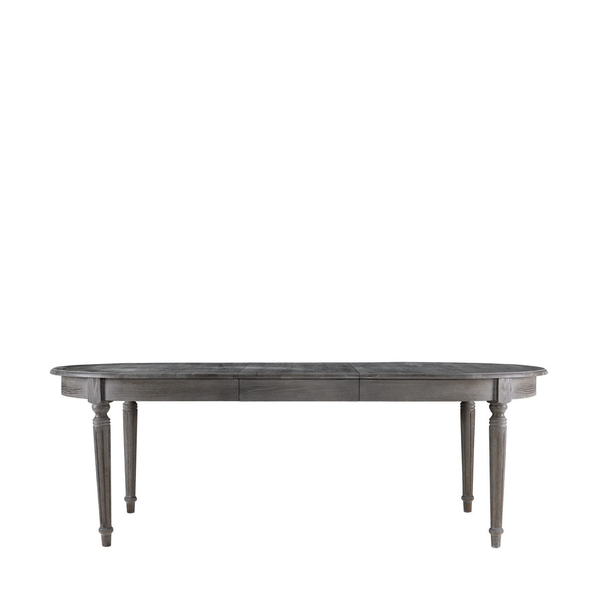 Овальный стол на изящных, сужающихся книзу рифленых ножках, выполнен из патинированного дуба в темно-сером финише. Столешница может раздвигается на ширину вставного листа ( 50 см).
