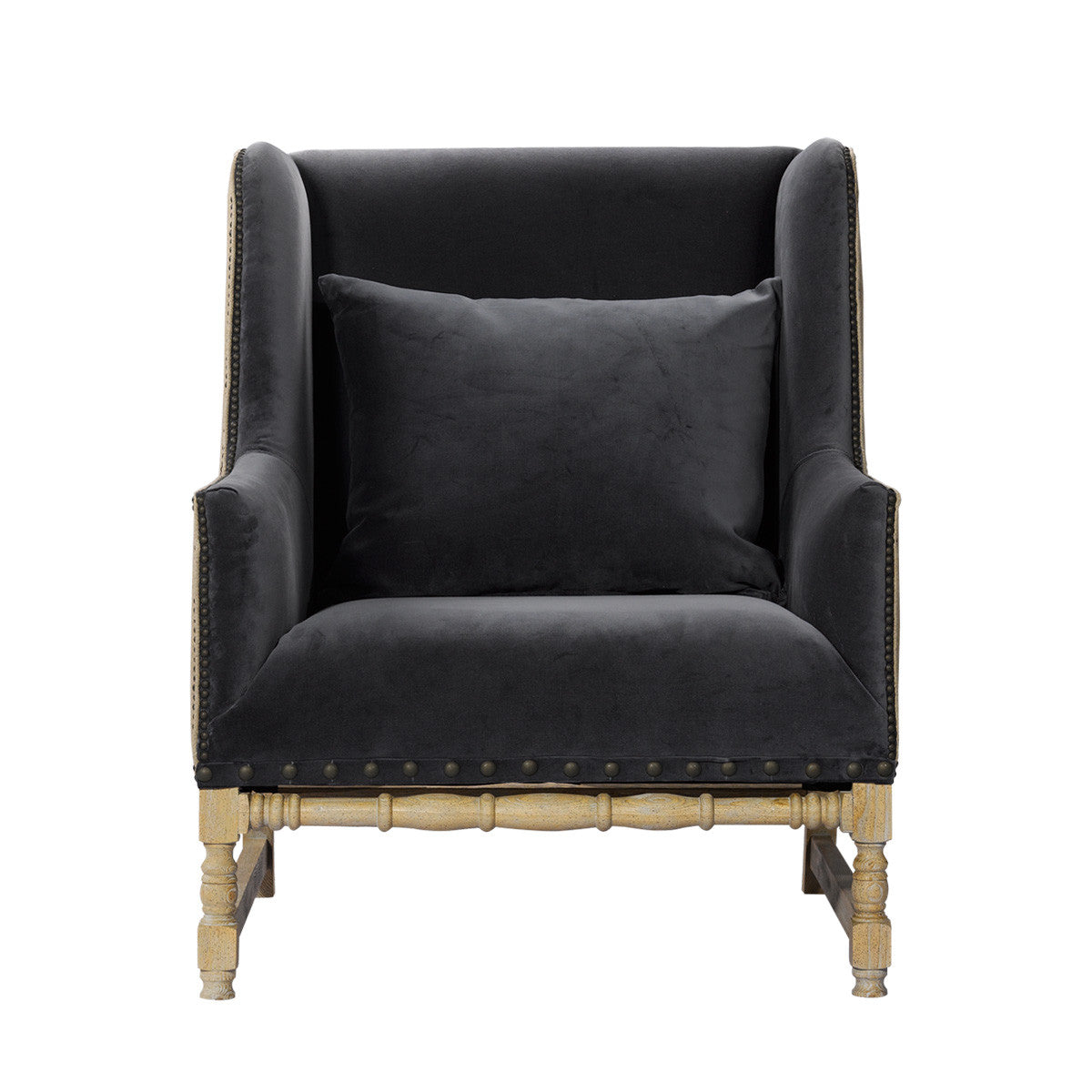 Кресло, обивка которого выполнена из натурального велюра и рогожки. Ручная обработка по краю декоративными гвоздями из состаренной латуни. Восьминаправленная пружинная подвеска ручной обвязки. Координационная спинка и подушки наполнены 50% пух-перо и 50% полифайбер. Продается с одной подушкой из бельгийского льна размером 58,5 х 58,5 см с фирменным логотипом. Ножки изготовлены из ясеня.