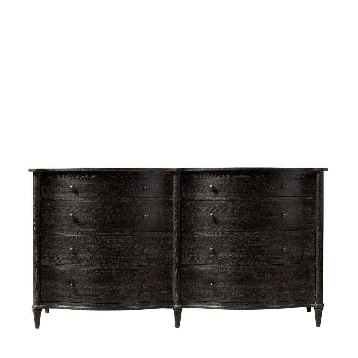 Тумба-комод в классическом стиле с фигурным фасадом выполнена в великолепном черном матовом финише. Основа комода изготовлена из массива состаренного дуба. Восемь выдвижных ящиков оснащены деревянными направляющими.