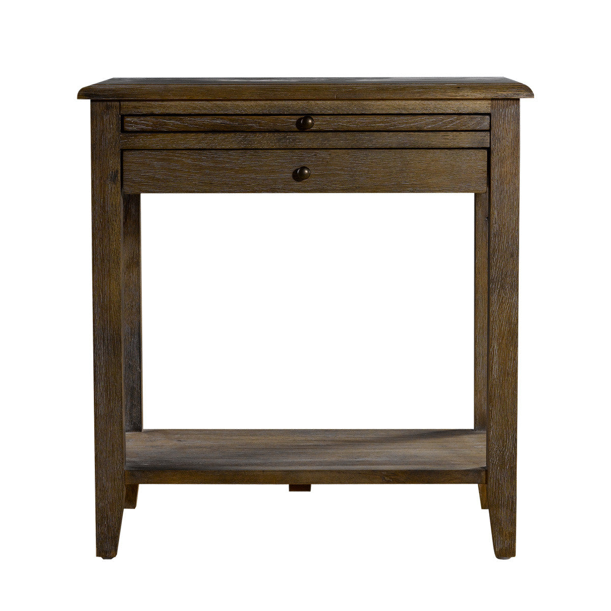 Приставной столик с выдвижным листом и одним ящиком. Древесина отшлифована и обработана металлической щеткой для усиления рельефа дерева, завершающая матовая отделка.Изготовлен из состаренного патинированного дуба.