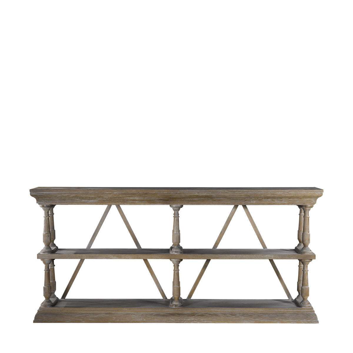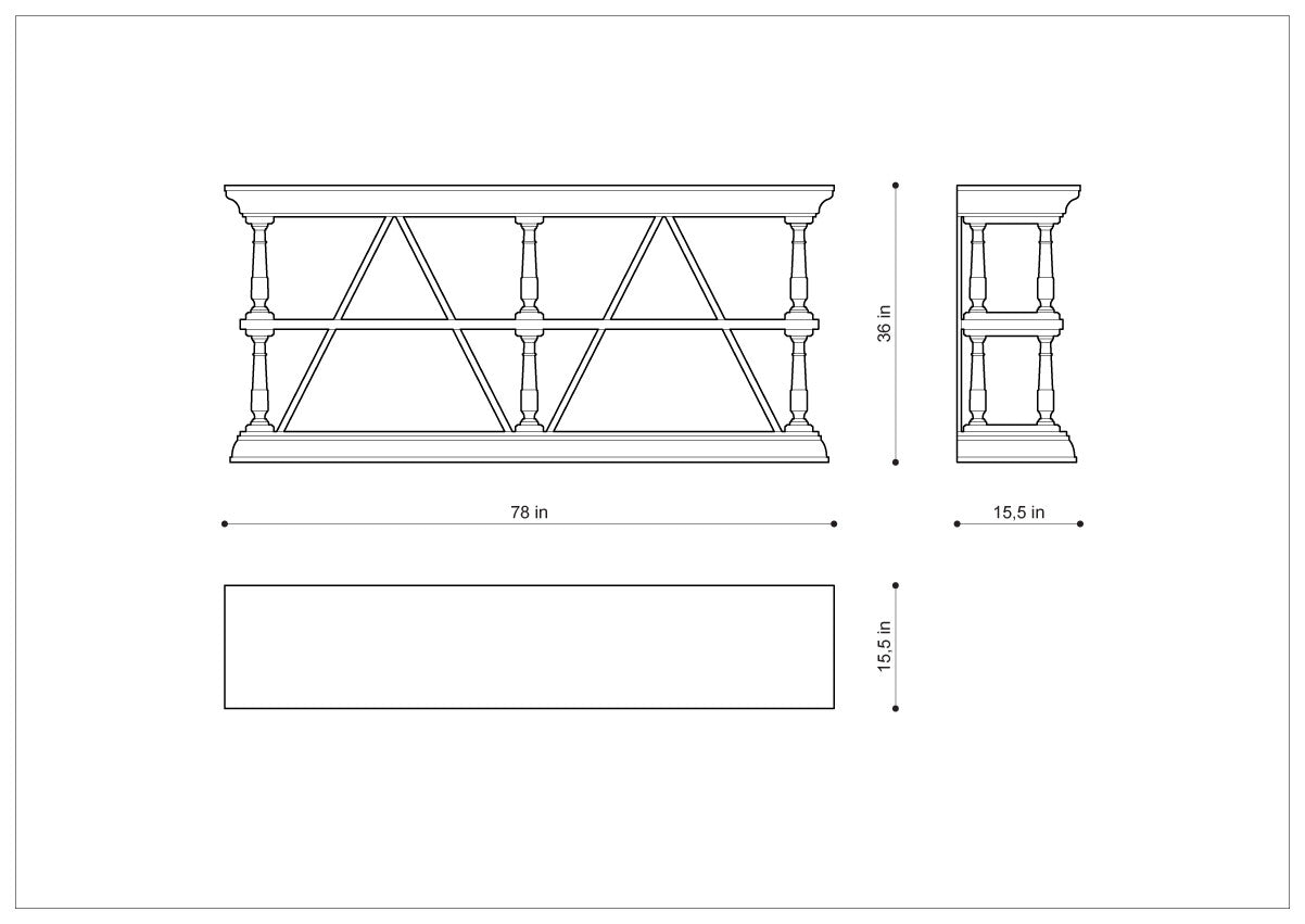 Классической формы консоль изготовлена из массива дуба. Двойная крестовина является элементом декора, обеспечивающим дополнительную устойчивость. Древесина отшлифована и обработана металлической щеткой для усиления рельефа дерева, завершающая патинированная отделка.