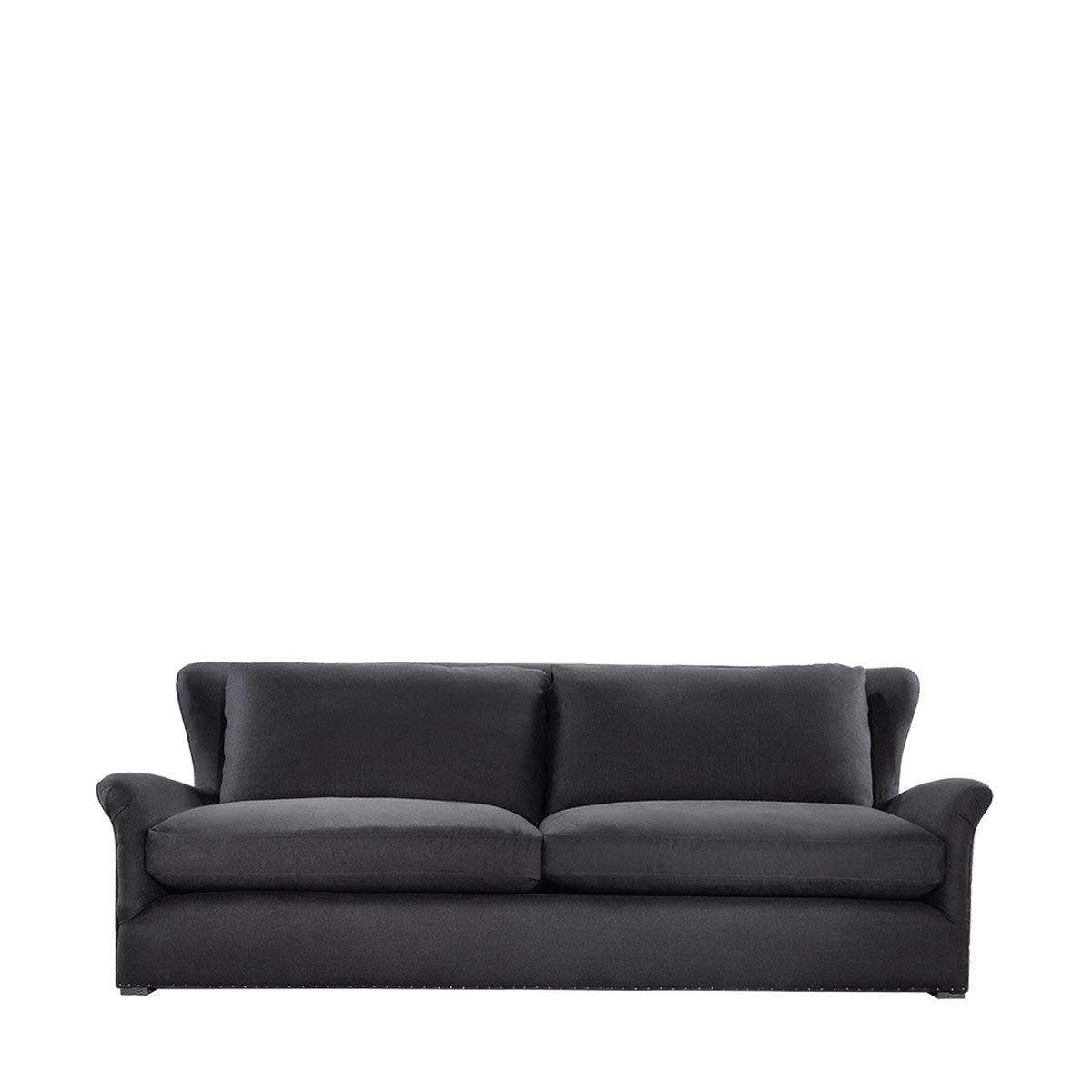 Утонченный диван со спинкой wing и подлокотниками в изысканном стиле. Обивка выполнена из натурального бельгийского льна черного цвета. Восьминаправленная пружинная подвеска ручной обвязки. Координационная спинка и подушки выполнены из 50% пух + перо, включая 50% полифайбера, обернутого вокруг полиформа со степенью жесткости 4.5.